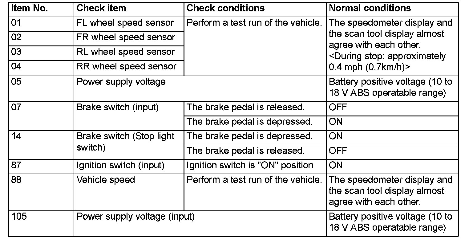 DATA LIST REFERENCE TABLE The following items can be read by the scan tool from the ABS-ECU input data.