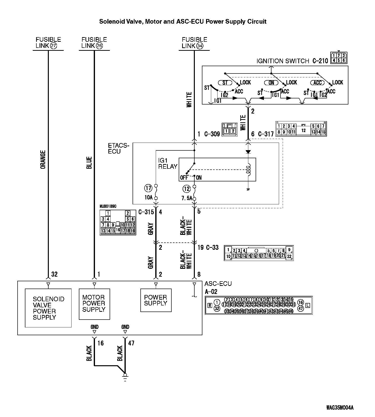 ^ ASC-ECU contains the power supply circuit (terminal No. 8) for ASC-ECU. When the ignition switch (IG1) is turned ON, the voltage is applied to the relay incorporated in ETACS-ECU to turn ON the relay, and the power is supplied from the fusible link No. 34 through multipurpose fuse No. 12.