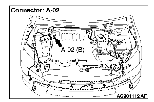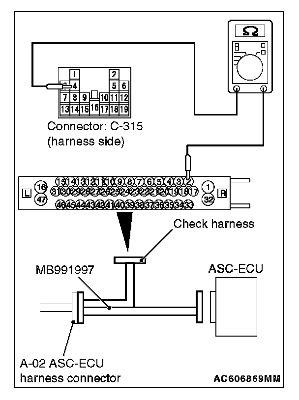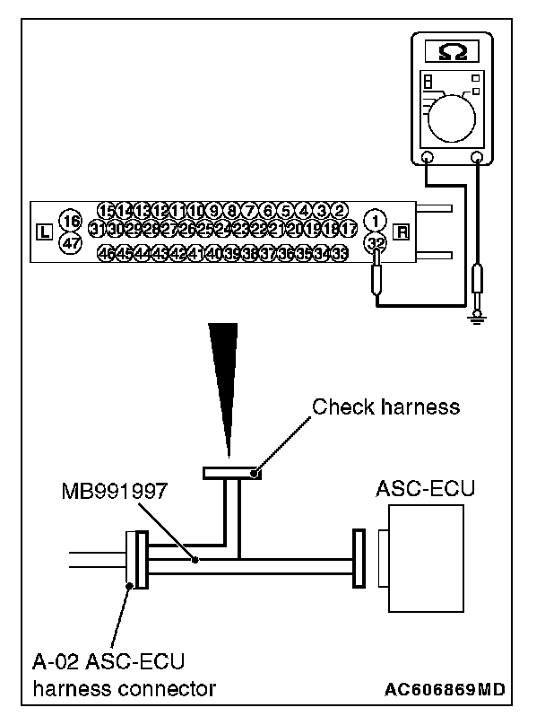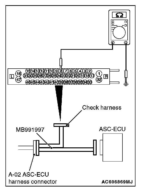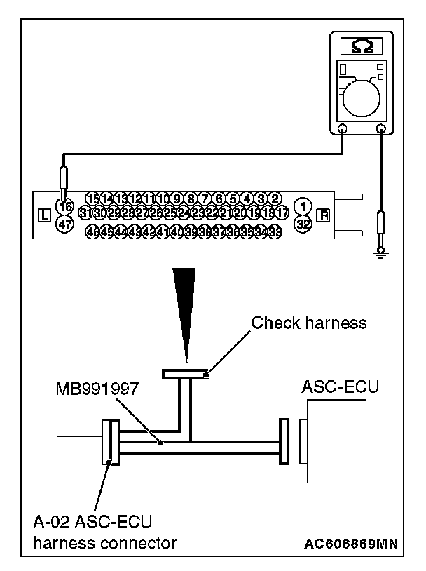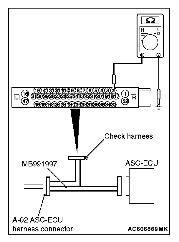 2. Disconnect the A-02 ASC-ECU connector, connect special tool ASC check harness (MB991997) to the harness-side connector, and then measure the resistance at the special tool connector side.