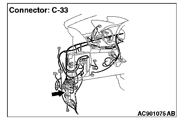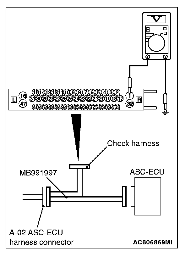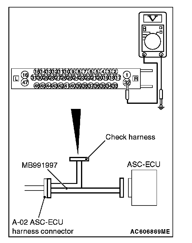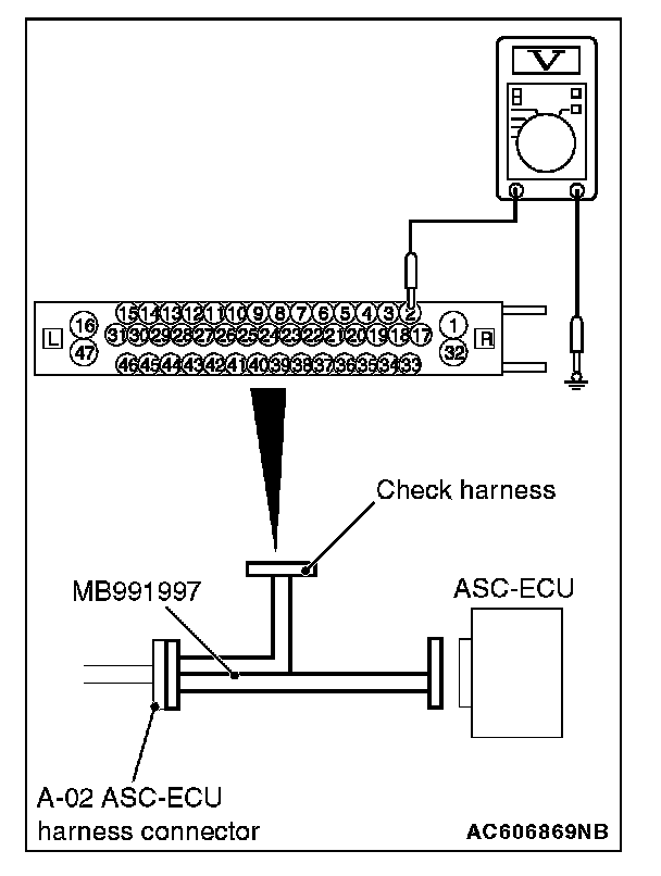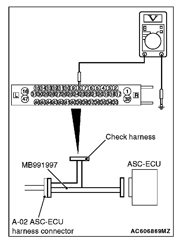 1. Disconnect the ASC-ECU connector, connect special tool ASC check harness (MB991997) to the harness-side connector, and then measure the voltage at the special tool connector side.