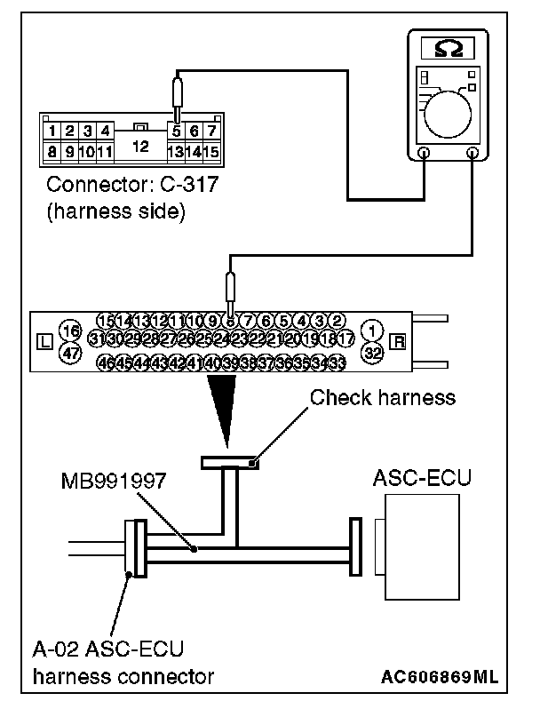 3. Measure the resistance between the A-02 ASC-ECU connector terminal No. 8 and the C-317 ETACS-ECU connector terminal No. 5.