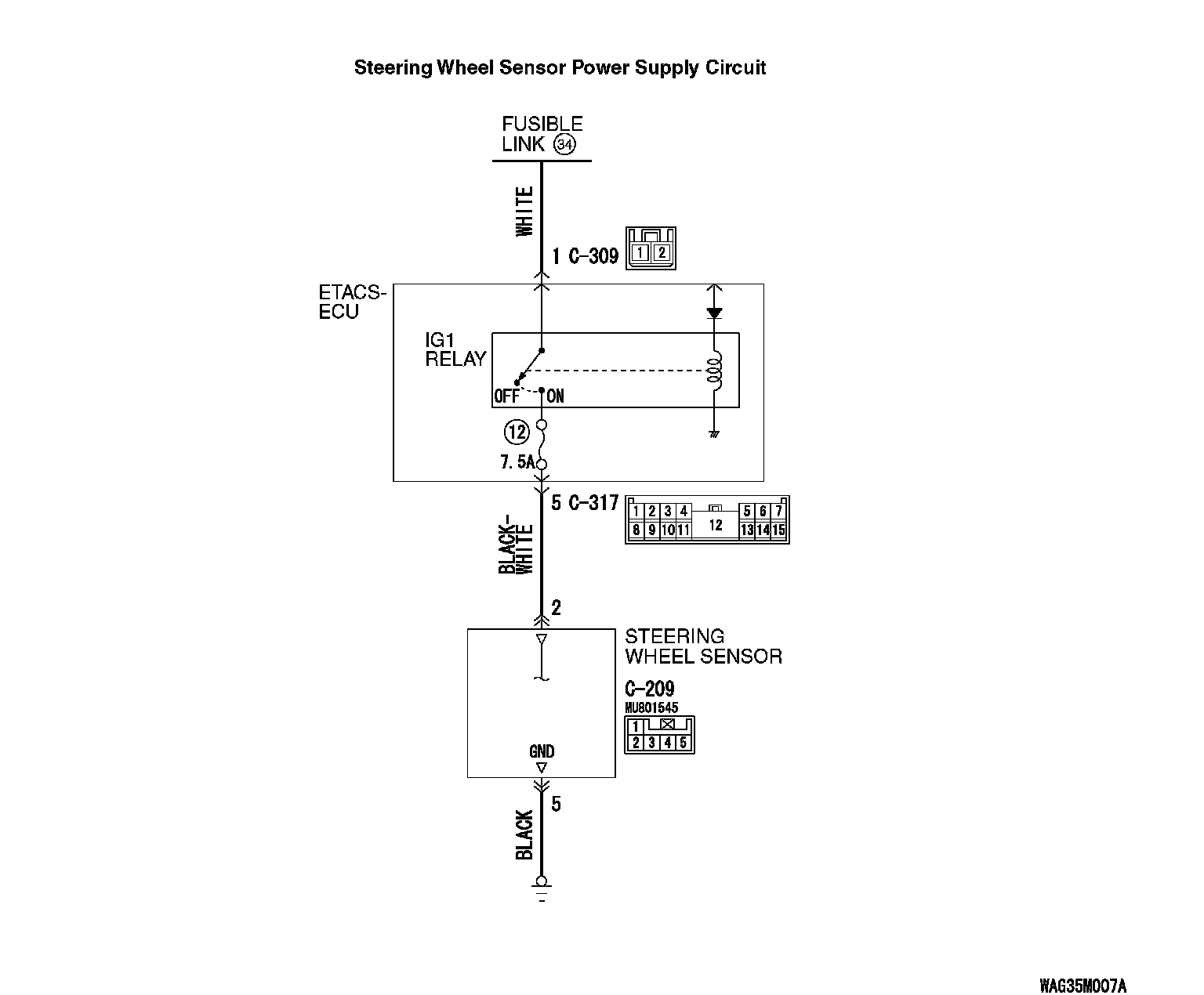 ^ Steering wheel sensor contains the power supply circuit (terminal No. 2) for Steering wheel sensor. The power is supplied from the ETACS-ECU (terminal No. 5). The power is supplied from the fusible link No. 33 through the multi-purpose fuse No. 12.
