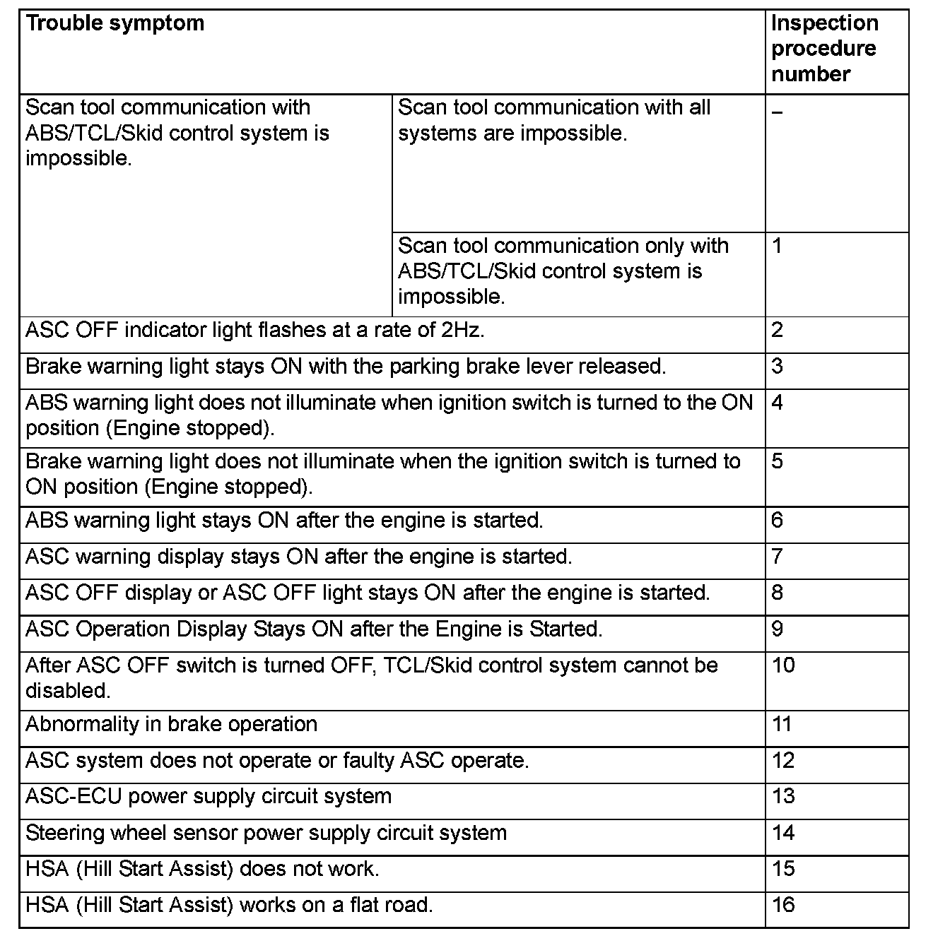 ^ ASC may operate in the following conditions without hard braking: Low mu road surface, high-speed turn, and bumpy road surface. When asking the customers, confirm that they have/have not encountered ABS operation in corresponding conditions.
