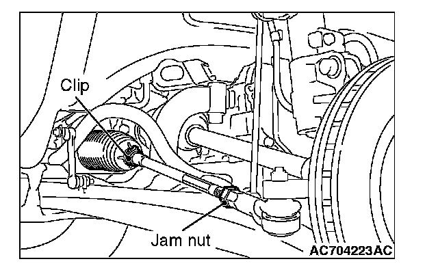 1. Adjust the toe-in by undoing the clip and jam nut, and turning the left and right tie rod turnbuckles by the same amount (in opposite directions).