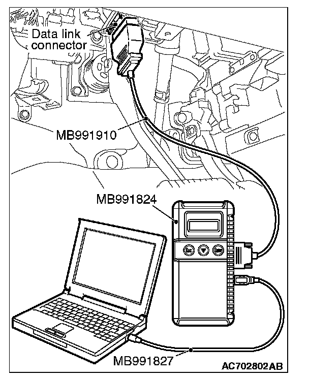 CAUTION: To prevent damage to scan tool MB991958, always turn the ignition switch to the "LOCK" (OFF) position before connecting or disconnecting scan tool MB991958.