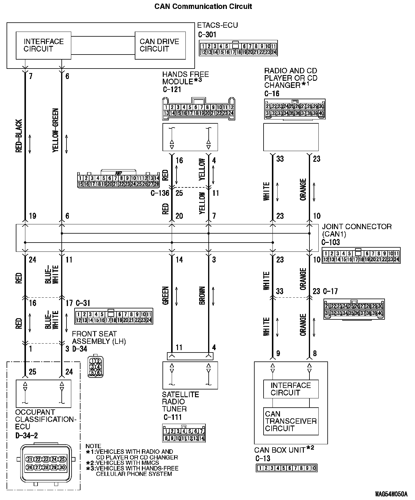 DIAGNOSTIC ITEM 23: Diagnose when the scan tool cannot receive the data sent by satellite radio tuner [vehicles with satellite radio].CAUTION: When servicing a CAN bus line, ground yourself by touching a metal object such as an unpainted water pipe. If you fail to do so, a component connected to the CAN bus line may be damaged.