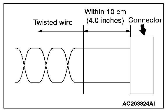- If the connector or wire on the main bus line or the sub-bus wire is replaced, the frayed end of the twisted wire should be within 10 cm (4 inches) from the connector. If it exceeds 10 cm (4 inches), twist the wiring harness just like the original twisted wire. If the frayed end exceeds 10 cm (4 inches), noise suppression is deteriorated, causing a communication error.