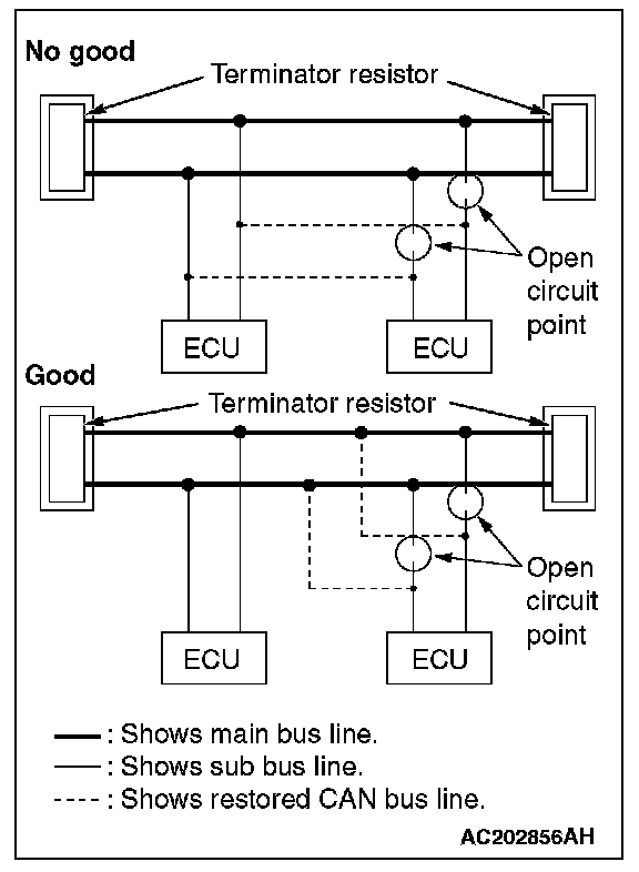 - If a sub-bus line is repaired, splice a new wire directly into the main bus line. If a new wire is spliced into the sub-bus line, which is connected to another device, the CAN communication will be disabled.