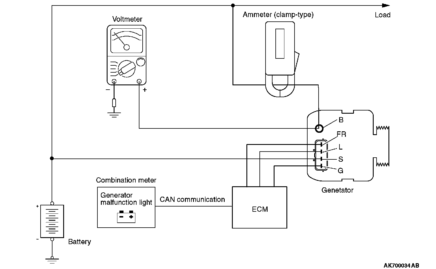NOTE: Disconnecting the generator output wire and connecting the ammeter may not thoroughly diagnose an output current drop problem because of an insufficient connection between terminal "B" and the output wire.