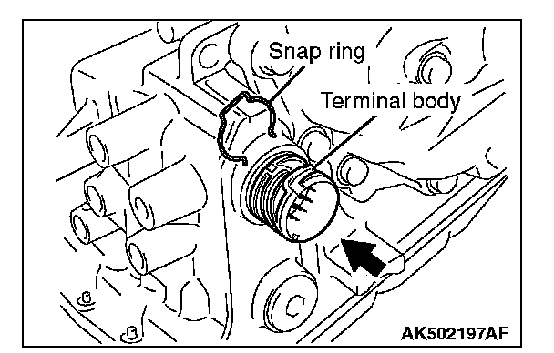 13. Remove the snap ring from the terminal body, and press the terminal body into the transaxle case.