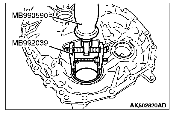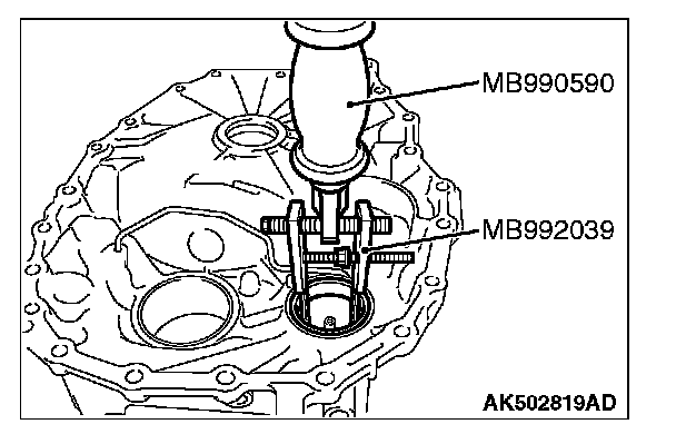 20. Using the special tools MB990590 and MB992039, remove the outer race of differential side bearing from the converter housing.