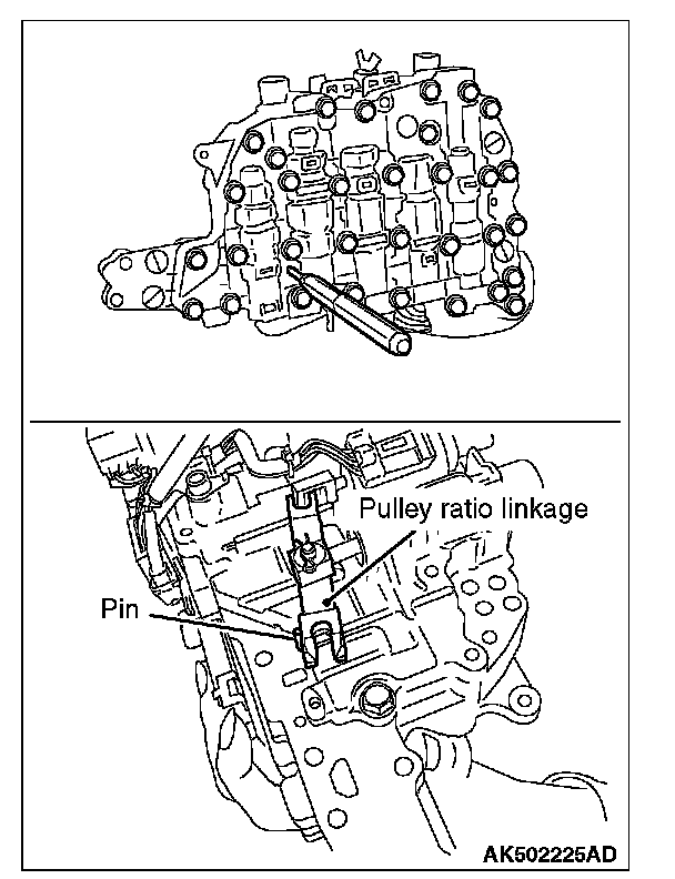 1) Insert pins etc. ([diameter] 3 mm) into linkage stopper holes of the control valve assembly to fix the pulley ratio linkage.