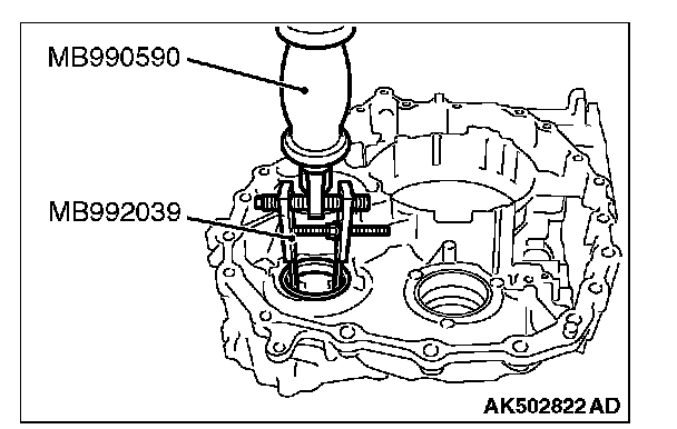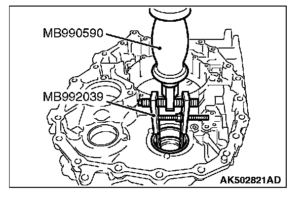 54. Using the special tools MB990590 and MB992039, remove outer race of the differential side bearing from the transaxle case.