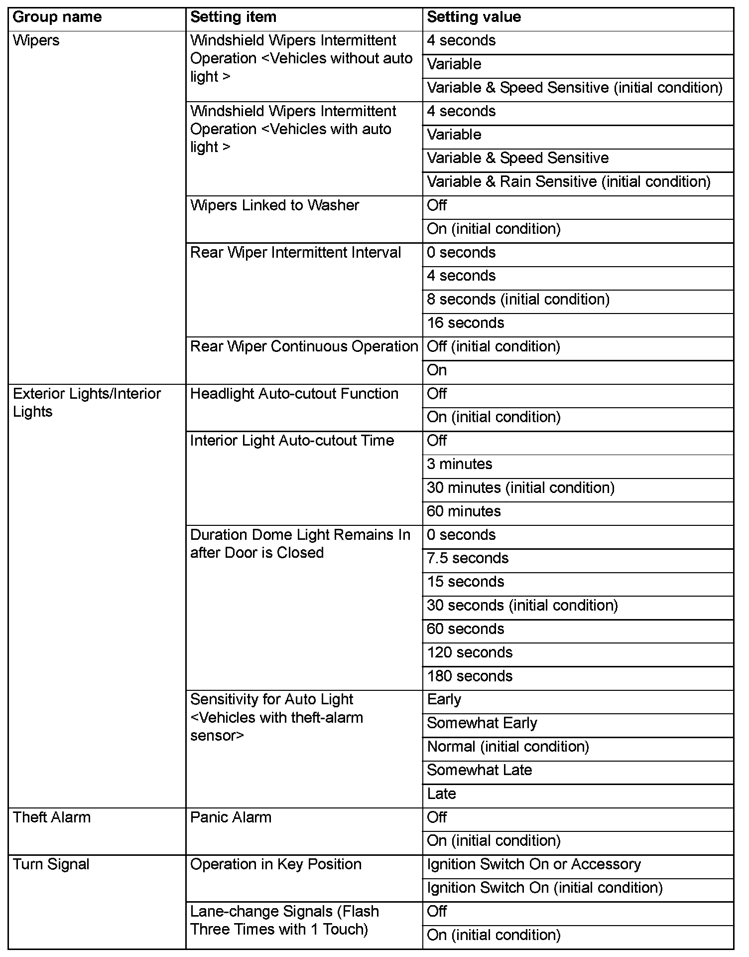 - If the setting of "Wipers Linked to Washer" is changed, it cannot be reset to the initial value by the multivision display.