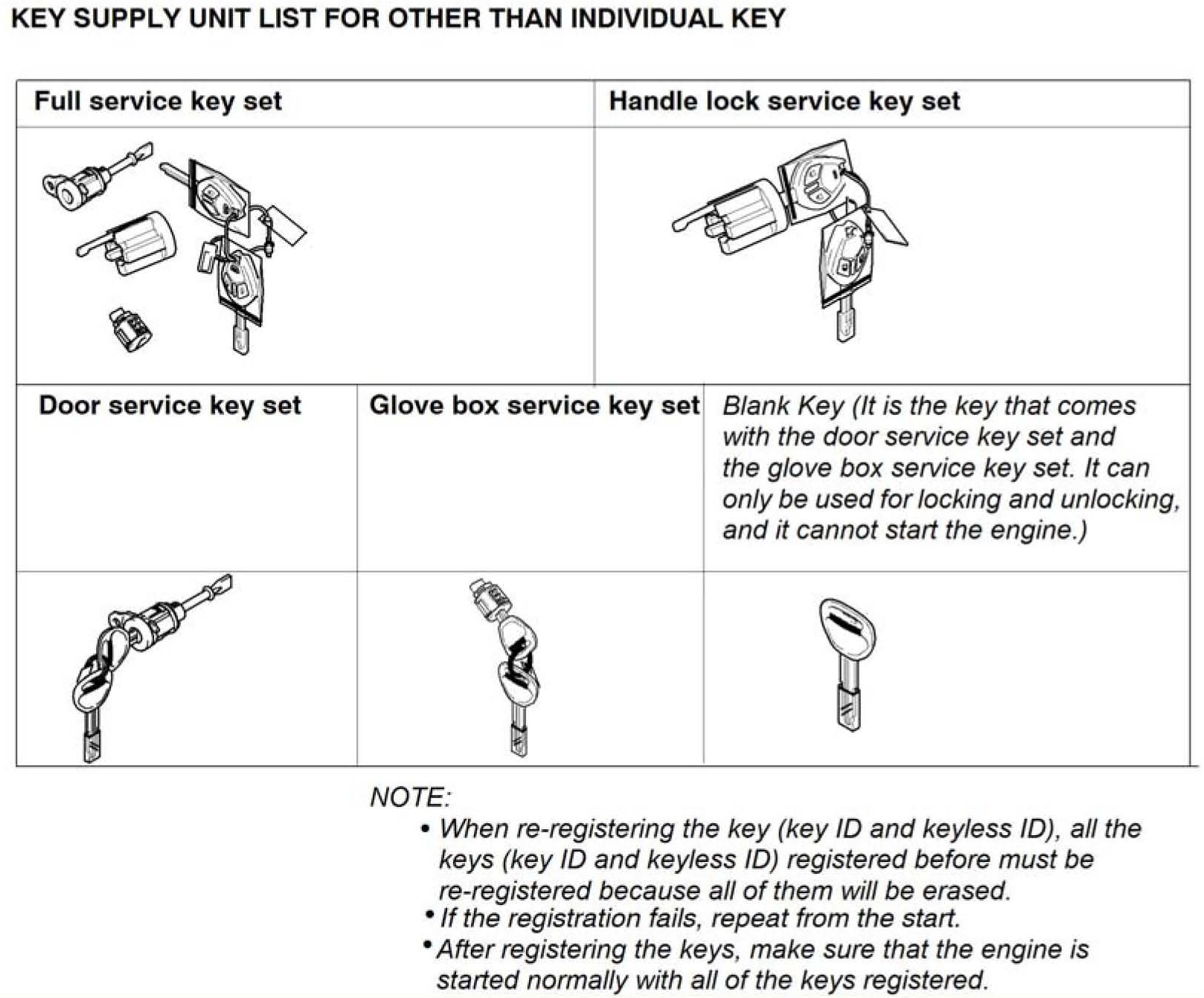- "Key Registration (Barcode No.)": When the ignition key is replaced by the full service key set, the handle lock service key set, immobilizer and keyless key assembly or immobilizer key assembly is replaced by the piece.