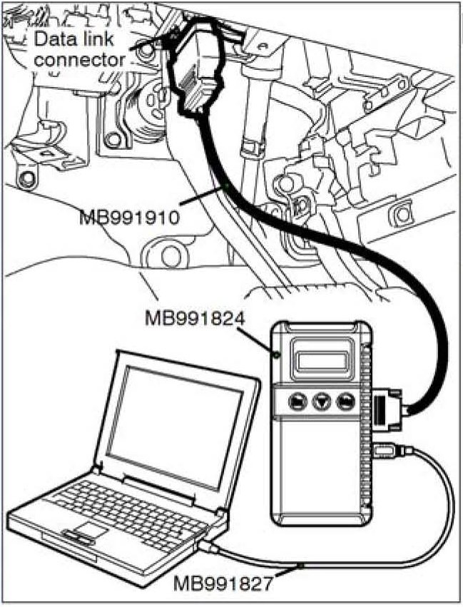 CAUTION: To prevent damage to scan tool MB991958, always turn the ignition switch to the "LOCK" (OFF) position before connecting or disconnecting scan tool MB991958.