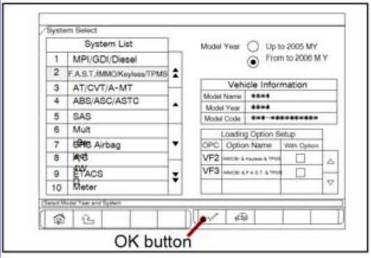 2. Select "F.A.S.T./IMMO/Keyless/TPMS" button from the "System Select" screen. Then, select the applicable option code item and push the OK button.