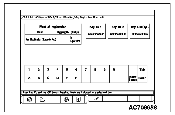 The ID codes necessary for the engine immobilizer system, the keyless entry system and the TPMS can be registered using the scan tool MB991958 (M.U.T.-III sub assembly). WCM and keyless operation key are indicated as F.A.S.T and F.A.S.T.-key respectively in the scan tool MB991958 (M.U.T.-III sub assembly) screen.