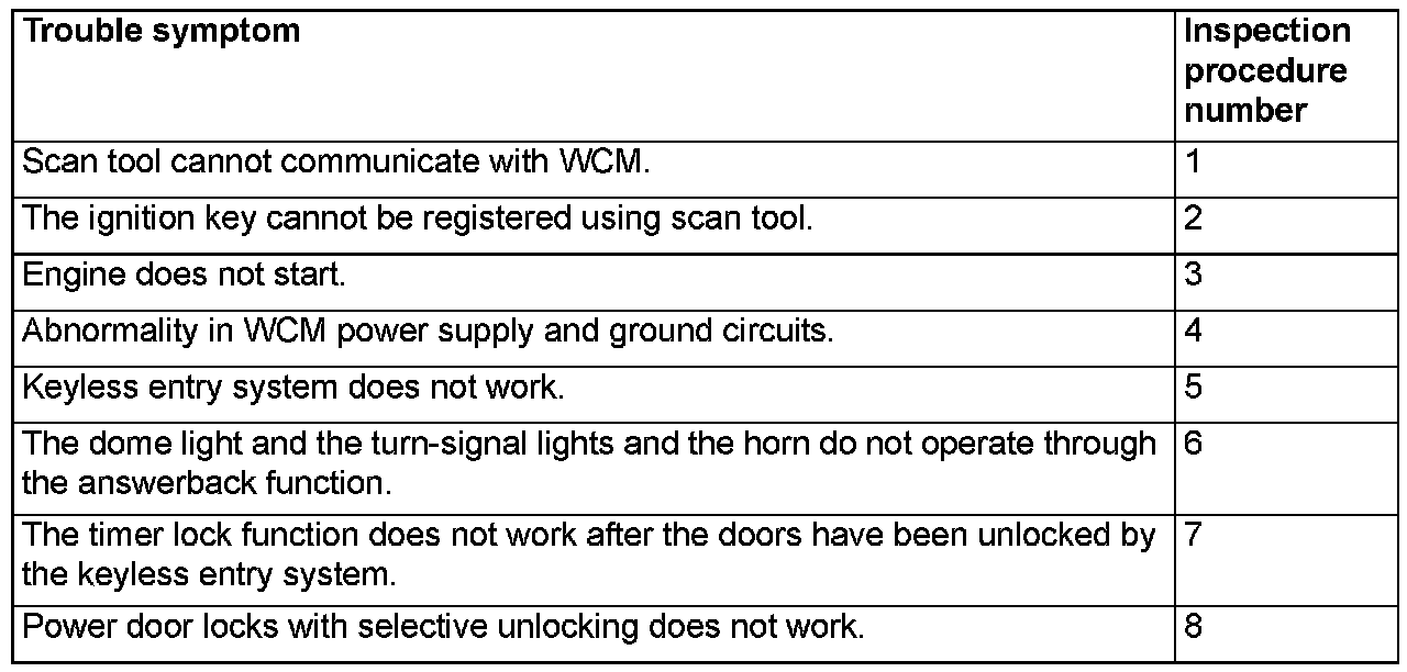 TROUBLE SYMPTOM CHARTCAUTION: During diagnosis, a DTC associated with other system may be set when the ignition switch is turned on with connector(s) disconnected. On completion, check all systems for DTC(s). If DTC(s) are set, erase them all.
