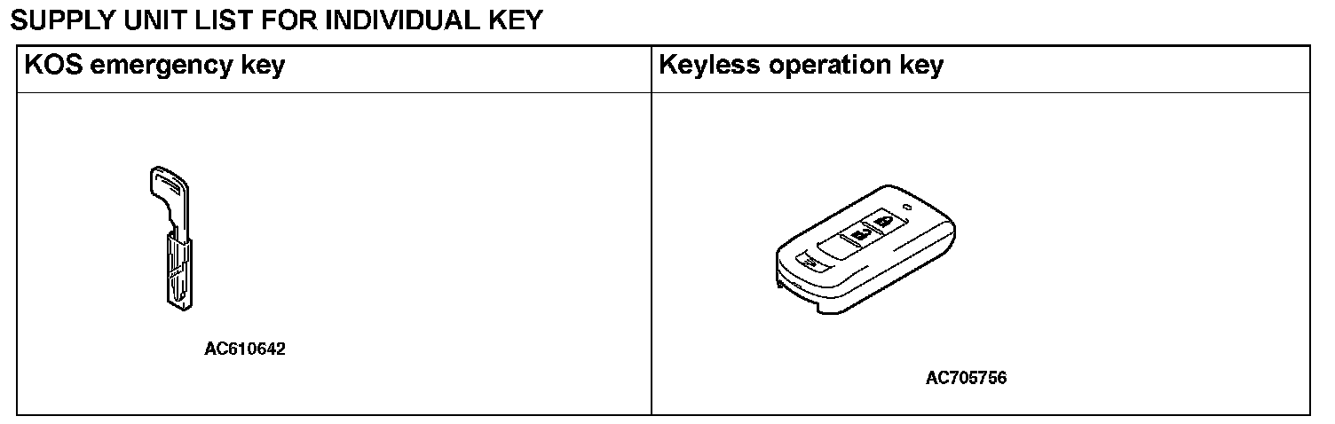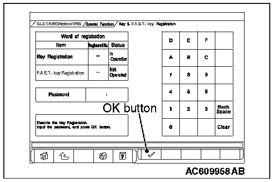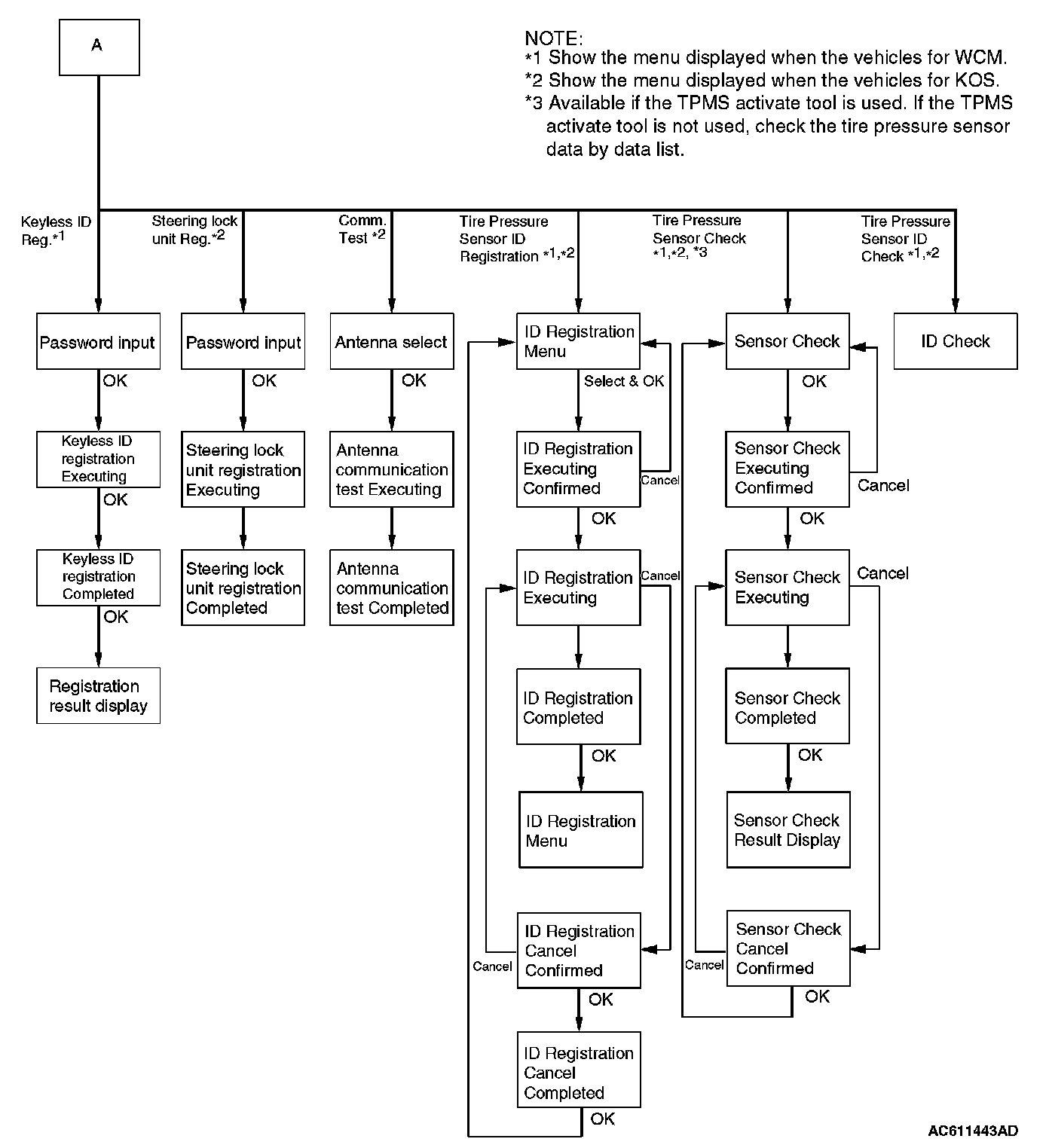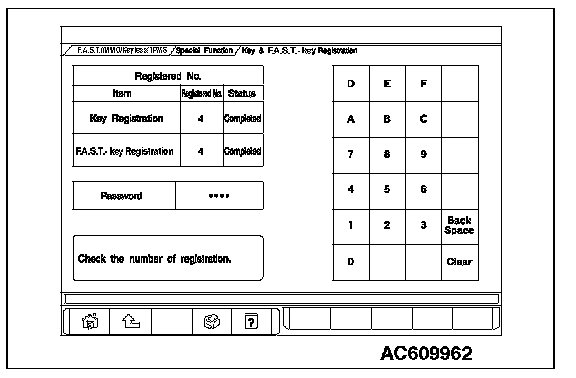By operating the scan tool MB991958 (M.U.T.-III sub assembly) screen, the ID code registration and the TPMS can be registered and antenna communication required to the keyless operation system can be performed. KOS and keyless operation key are indicated as F.A.S.T and F.A.S.T.-key respectively in the scan tool MB991958 (M.U.T.-III sub assembly) screen.