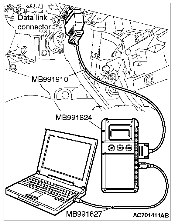 CAUTION: To prevent damage to scan tool MB991958, always turn the ignition switch to the "LOCK" (OFF) position before connecting or disconnecting scan tool MB991958.