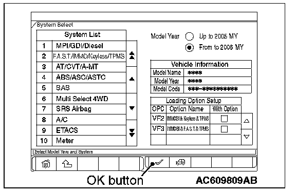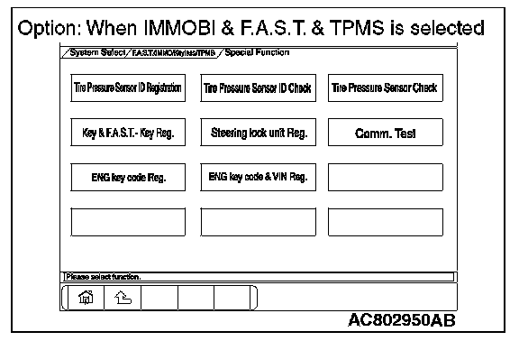 2. Select "F.A.S.T./IMMO/Keyless/TPMS" button from the "System Select" screen. Then, select the applicable option code item and push the OK button.