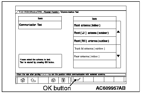 1. Select the antenna to be tested on "Communication Test" screen, and press the OK button with the keyless operation key placed within the communication operational area.