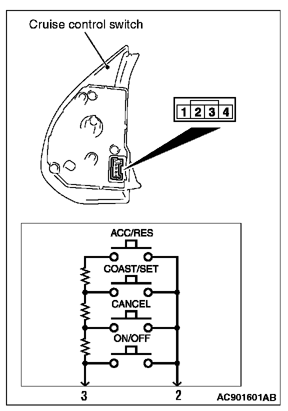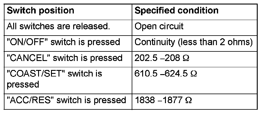 2. Measure the resistance between terminal 2 and terminal 3 when each of the "COAST/SET", "ACC/RES", "CANCEL" and "ON/OFF" switches is pressed. If values measured at the time each switch is pressed correspond to those in the table below, the resistance values are correct.