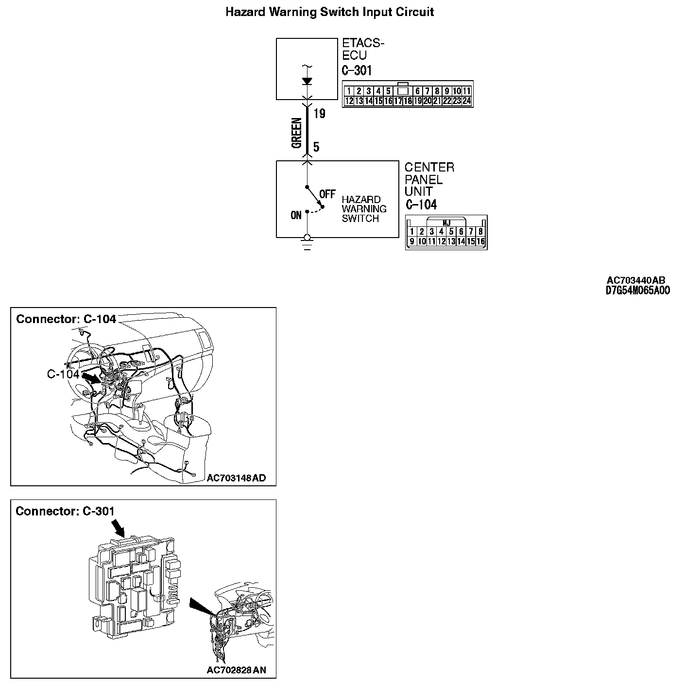 Inspection Procedure 11: ETACS-ECU does not receive any signal from the hazard warning light switch.Hazard Warning Switch Input Circuit: