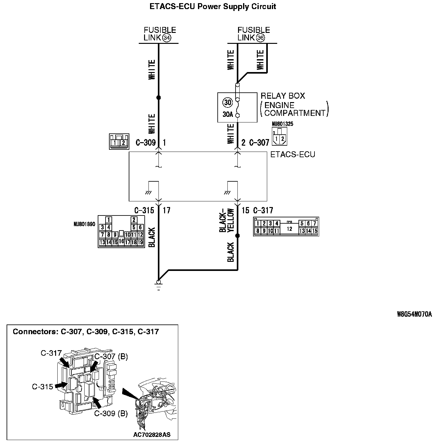 1. Disconnect ETACS-ECU connectors C-307 and C-309 measure the voltage available at the wiring harness side of the connector.