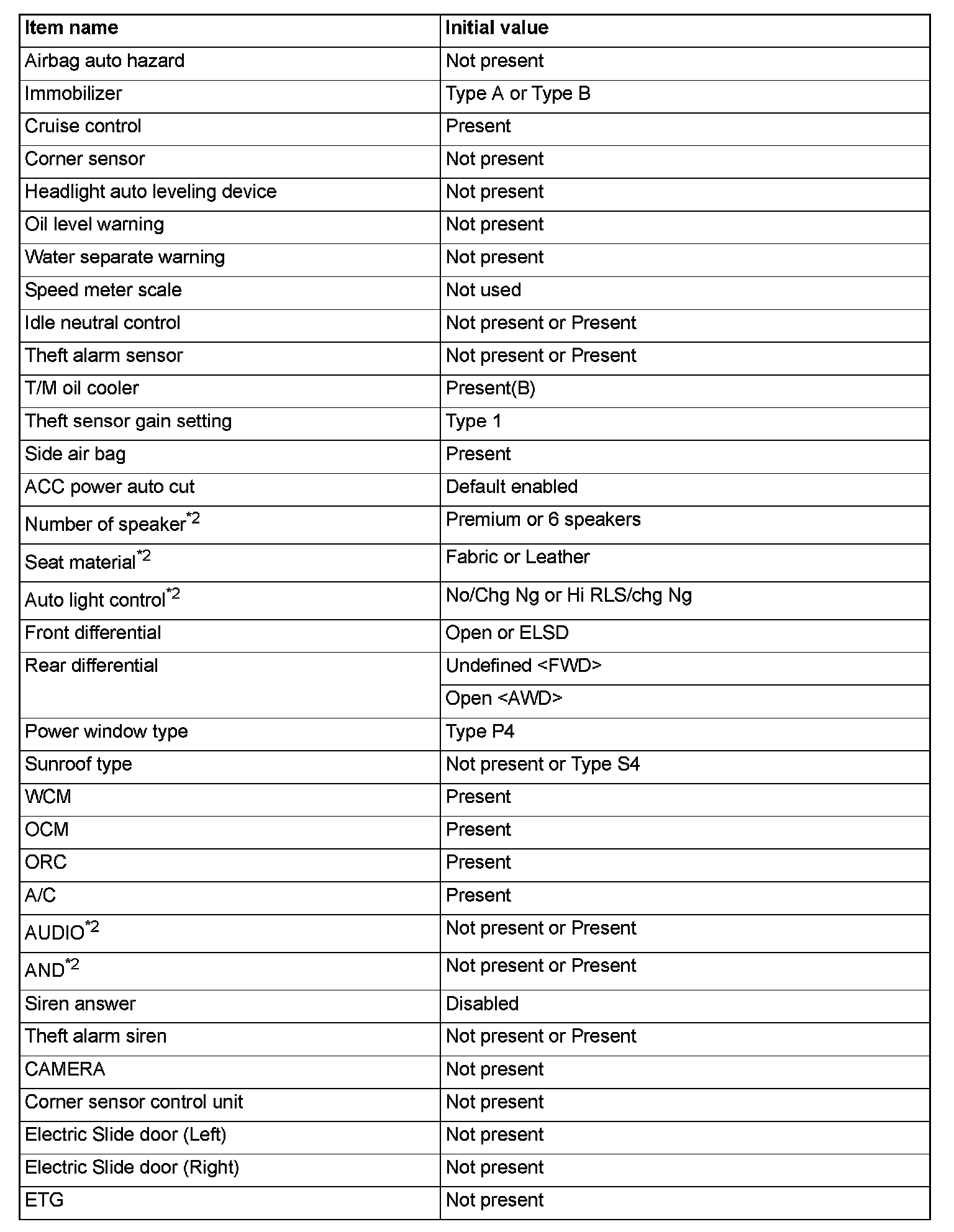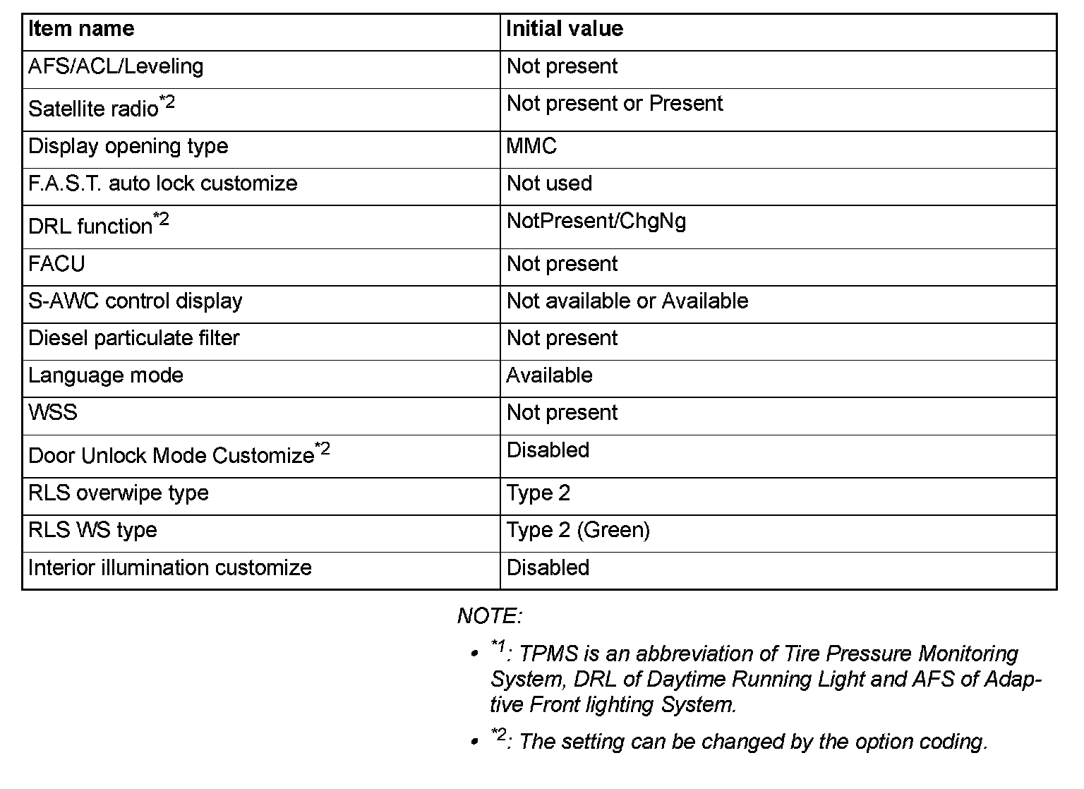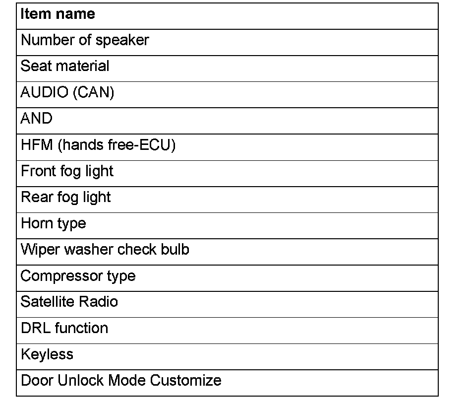 If there is any item indicated by the option coding after equipment change, set ETACS-ECU so that the option coding data corresponds with the equipment content. Functions and systems do not work normally if the setting does not correspond with the equipment.