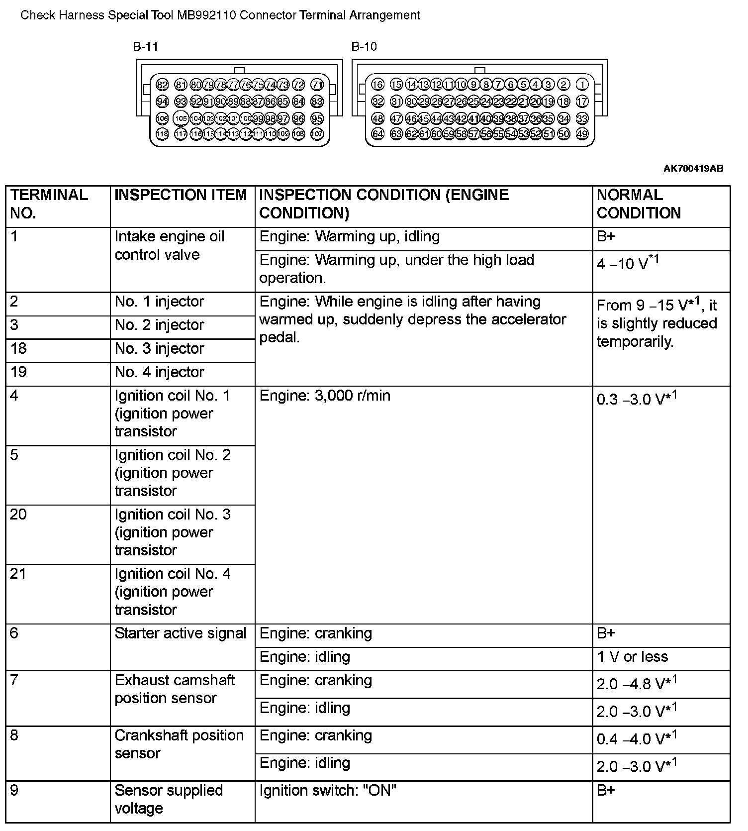 CHECK AT THE ENGINE CONTROL MODULE (ECM)1. Disconnect the ECM connectors B-10 and B-11, and connect check harness special tool MB992110 between the ECM connectors.