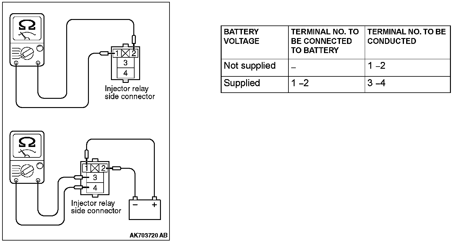 Inspect the Injector relay and throttle actuator control motor relay for continuity in accordance with the chart shown below.