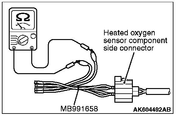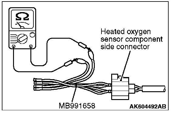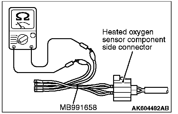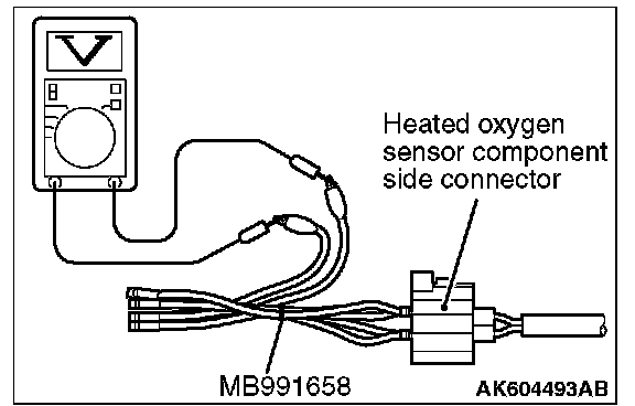 1. Disconnect the heated oxygen sensor connector and connect special tool MB991658 to the connector on the heated oxygen sensor side.