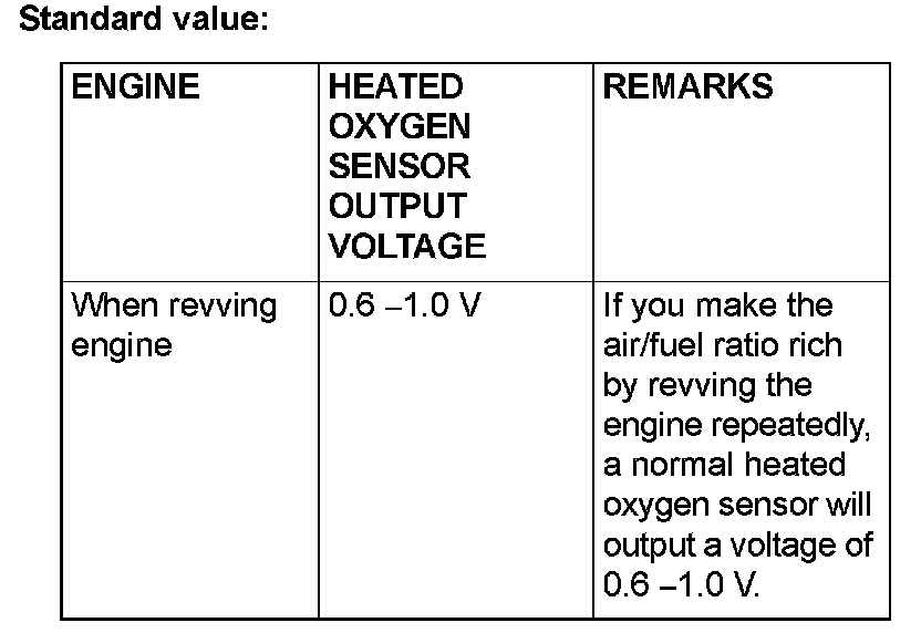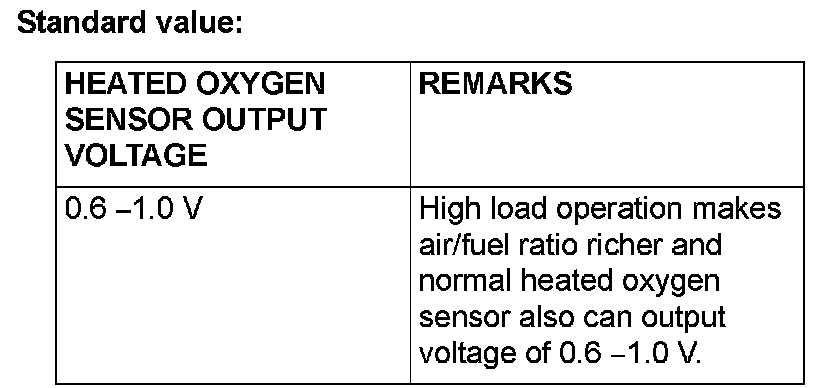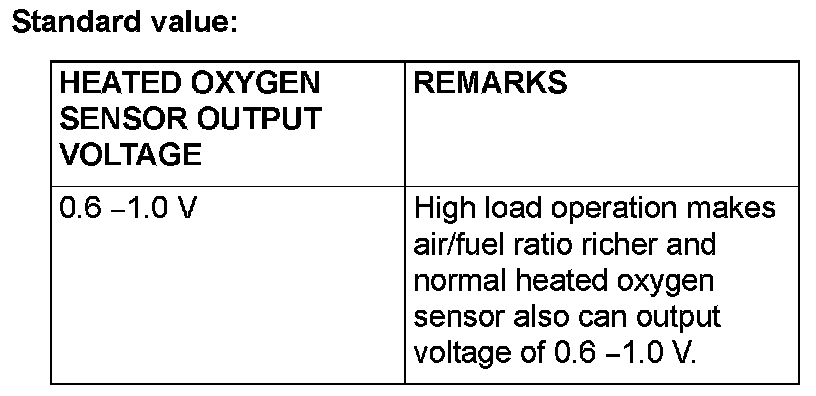 - If the temperature of sensing area does not reach the high temperature [of approximately 400 °C (752 °F) or more] even though the heated oxygen sensor is normal, the output voltage would be possibly low in spite of the rich air-fuel ratio.