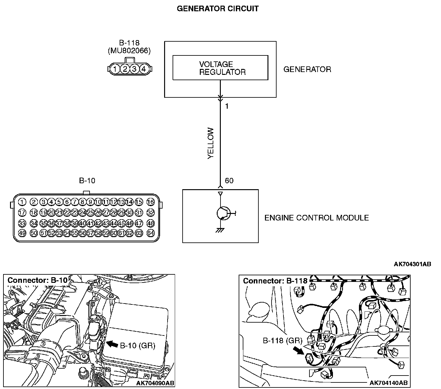 STEP 3. Check for short circuit to ground between generator connector B-118 (terminal No. 1) and ECM connector B-10 (terminal No. 60).