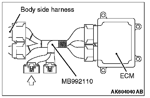1. Disconnect all ECM connectors. Connect the power plant ECU check harness special tool MB992110 between the separated connectors.