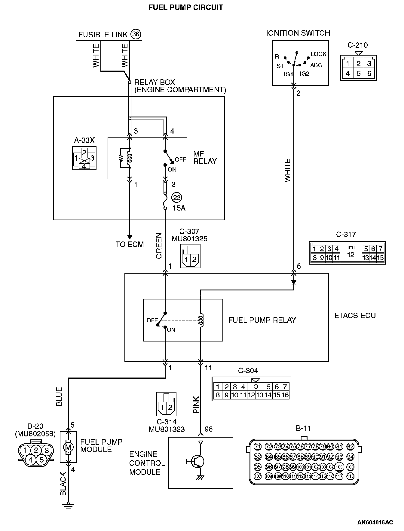 - The battery positive voltage is applied by the ignition switch to the fuel pump coil (C-317 ETACS-ECU connector terminal No. 6) in the ETACS-ECU. The ECM turns "ON" the relay by turning "ON" the power transistor in the unit so as to conduct power to the fuel pump relay coil (via the C-304 ETACS-ECU connector terminal No. 11).