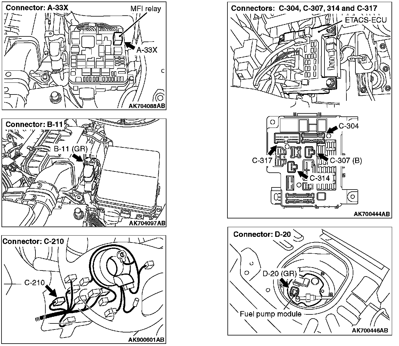 - The fuel pump drive power is supplied from MFI relay (terminal No. 2) to fuel pump relay (C-307 ETACS-ECU connector terminal No. 1) in the ETACS-ECU.