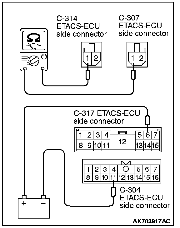 3. Check for continuity between the C-307 ETACS-ECU terminal No. 1 and C-314 ETACS-ECU terminal No. 1 while connecting and disconnecting the jumper wire at the negative battery terminal.