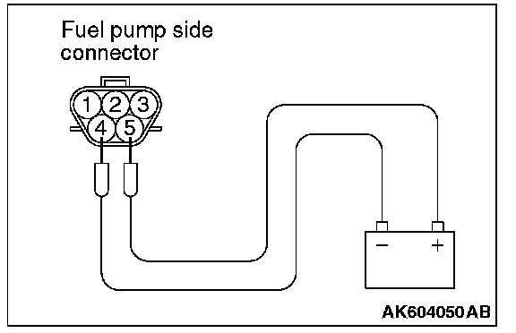 2. Use jumper wires to connect fuel pump connector terminal No. 5 to the positive battery terminal and terminal No. 4 to the negative battery terminal.