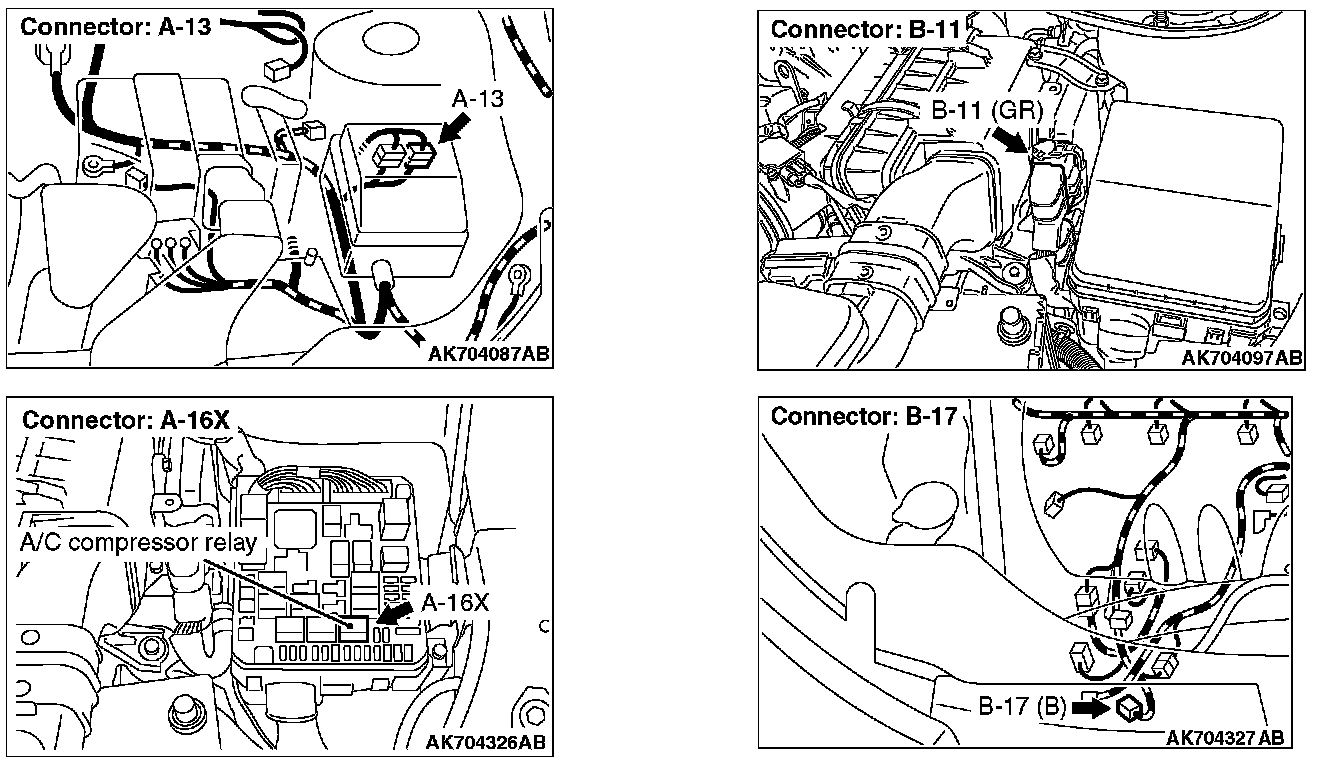 - Open or shorted A/C compressor relay circuit, harness damage, or connector damage.