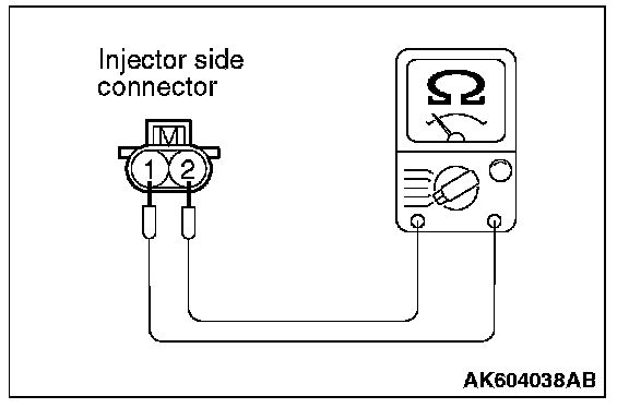 2. Measure the resistance between each injector side connector terminal No. 1 and No. 2.