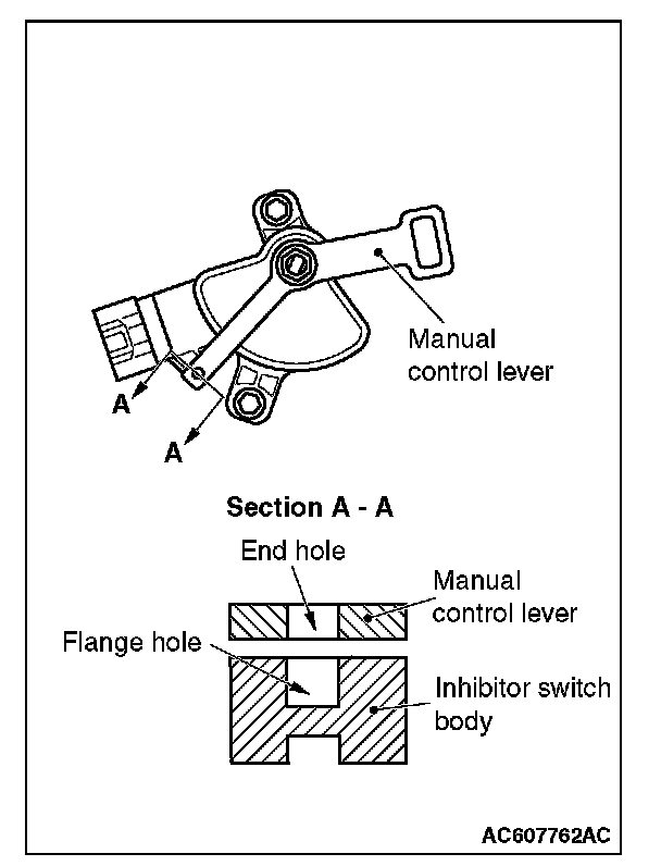 4. Align the hole at the end of the manual control lever and the hole in the Transmission range switch body flange (section A -A).