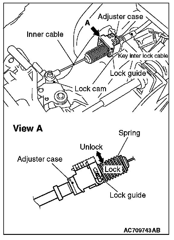3) Install the tip of the key interlock cable to the lock cam of the selector lever assembly, taking care not to twist the inner cable.