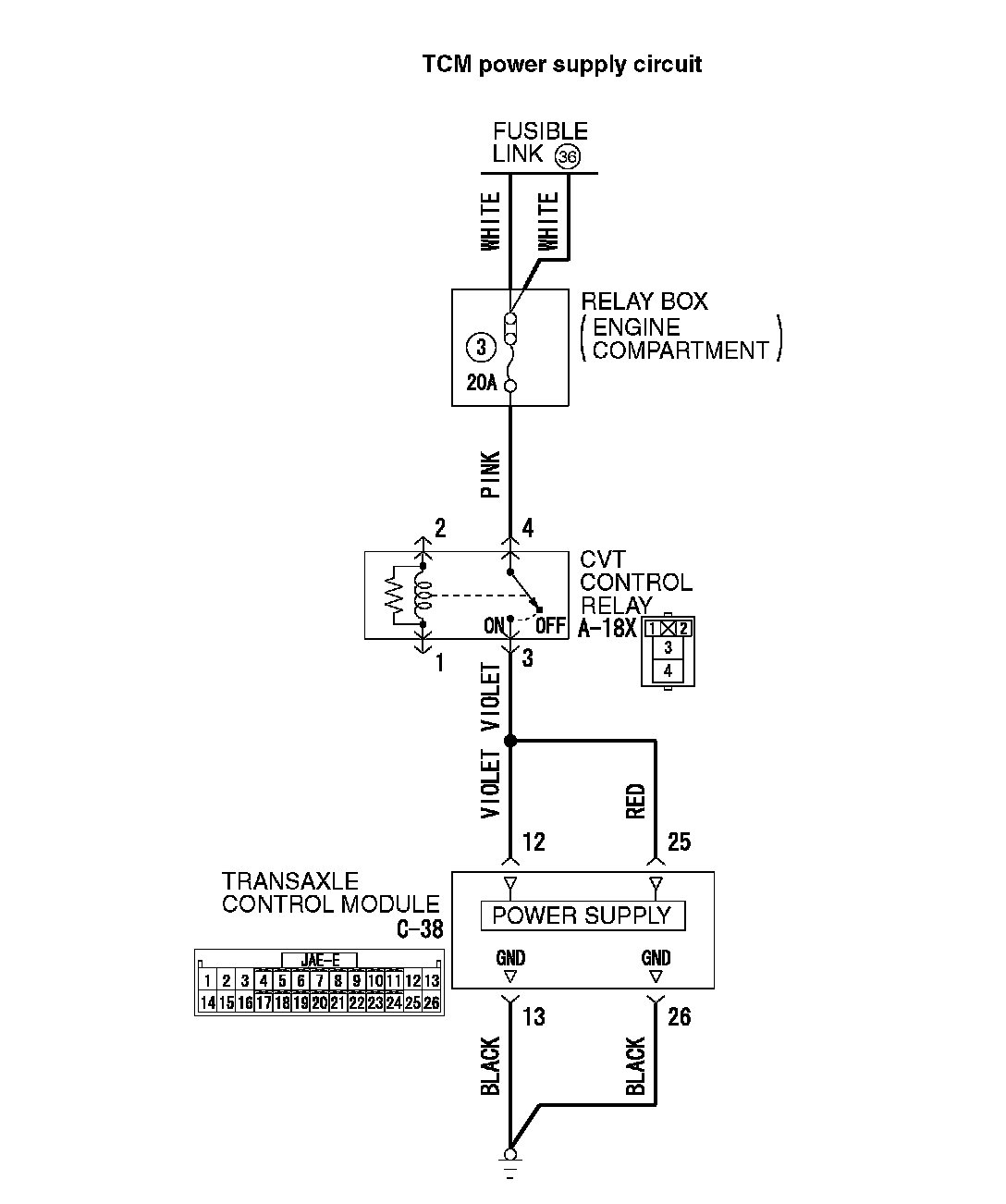 ^ Between A-18X CVT control relay connector (terminal No.3) and C-38 TCM connector (terminal No.25)