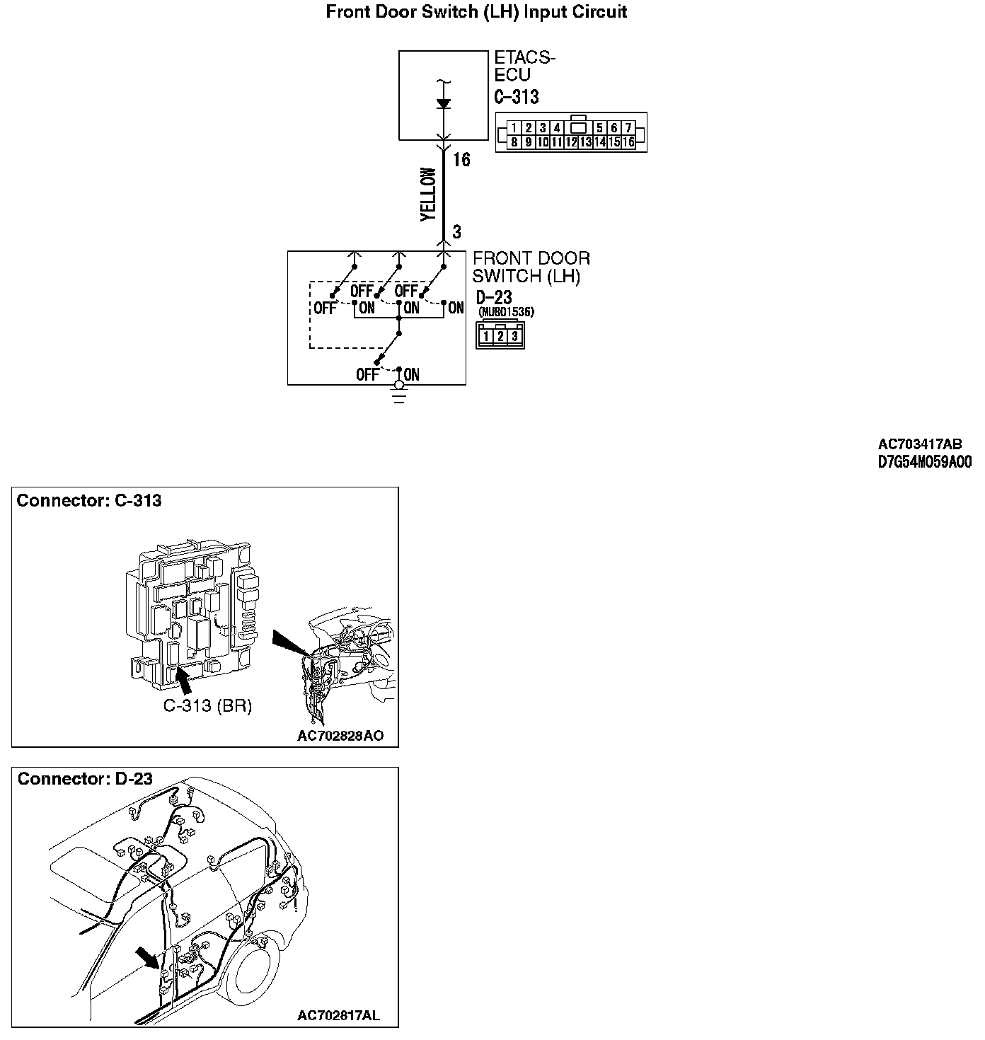 STEP 5. Check the wiring harness between driver's door switch connector D-23 (terminal 3) and ETACS-ECU connector C-313 (terminal 16).