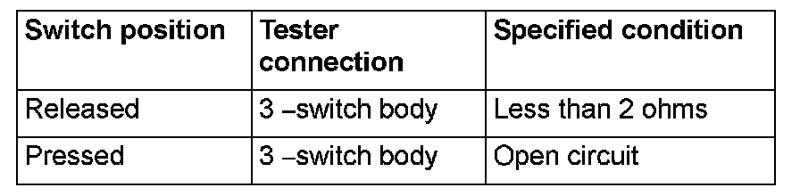 Remove the front door switch (LH). Then check the continuity between the switch terminals and the switch body.