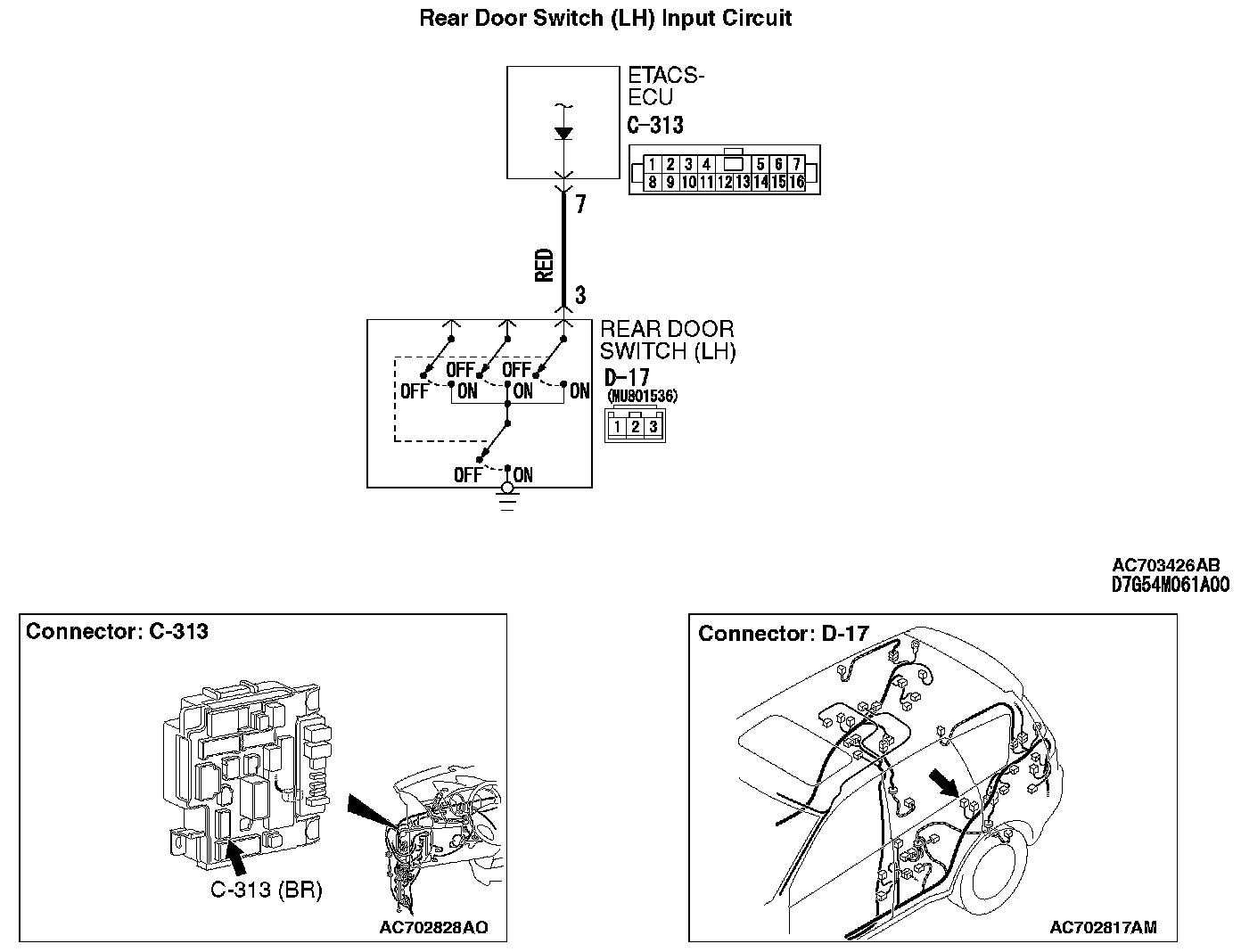 Q: Is the wiring harness between rear door switch connector D-17 (terminal 3) and ETACS-ECU connector C-313 (terminal 7) in good condition?