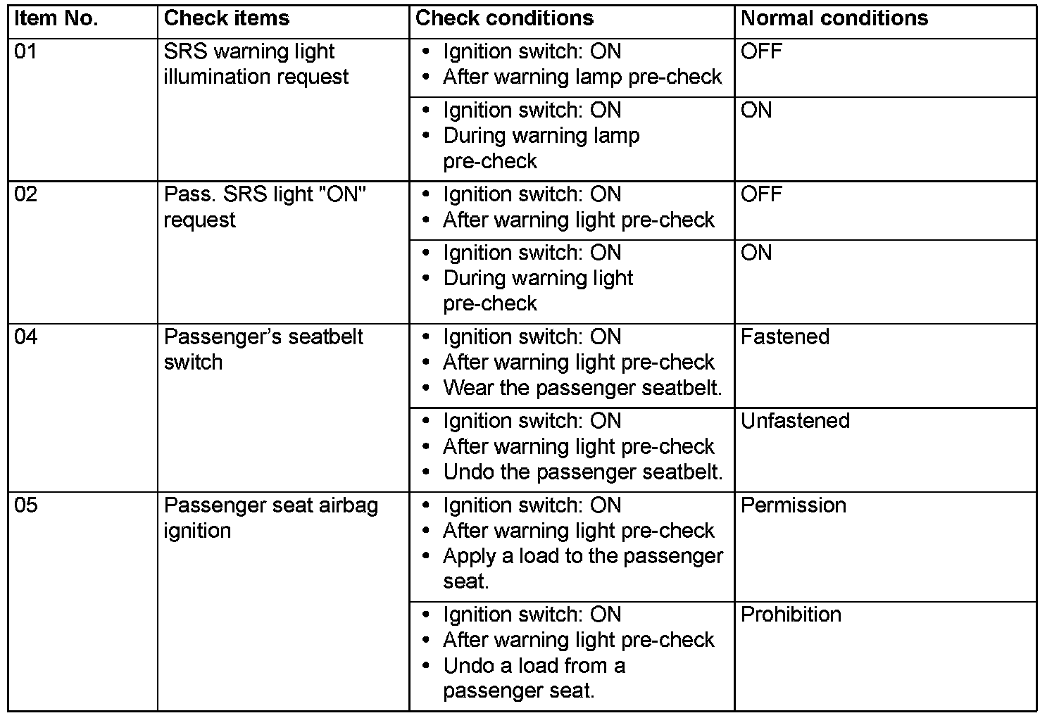 The following items can be read by the scan tool. from the SRS-ECU input data.